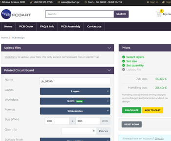 Custom cart for ordering printed circuit boards with backend business automation and business rules.